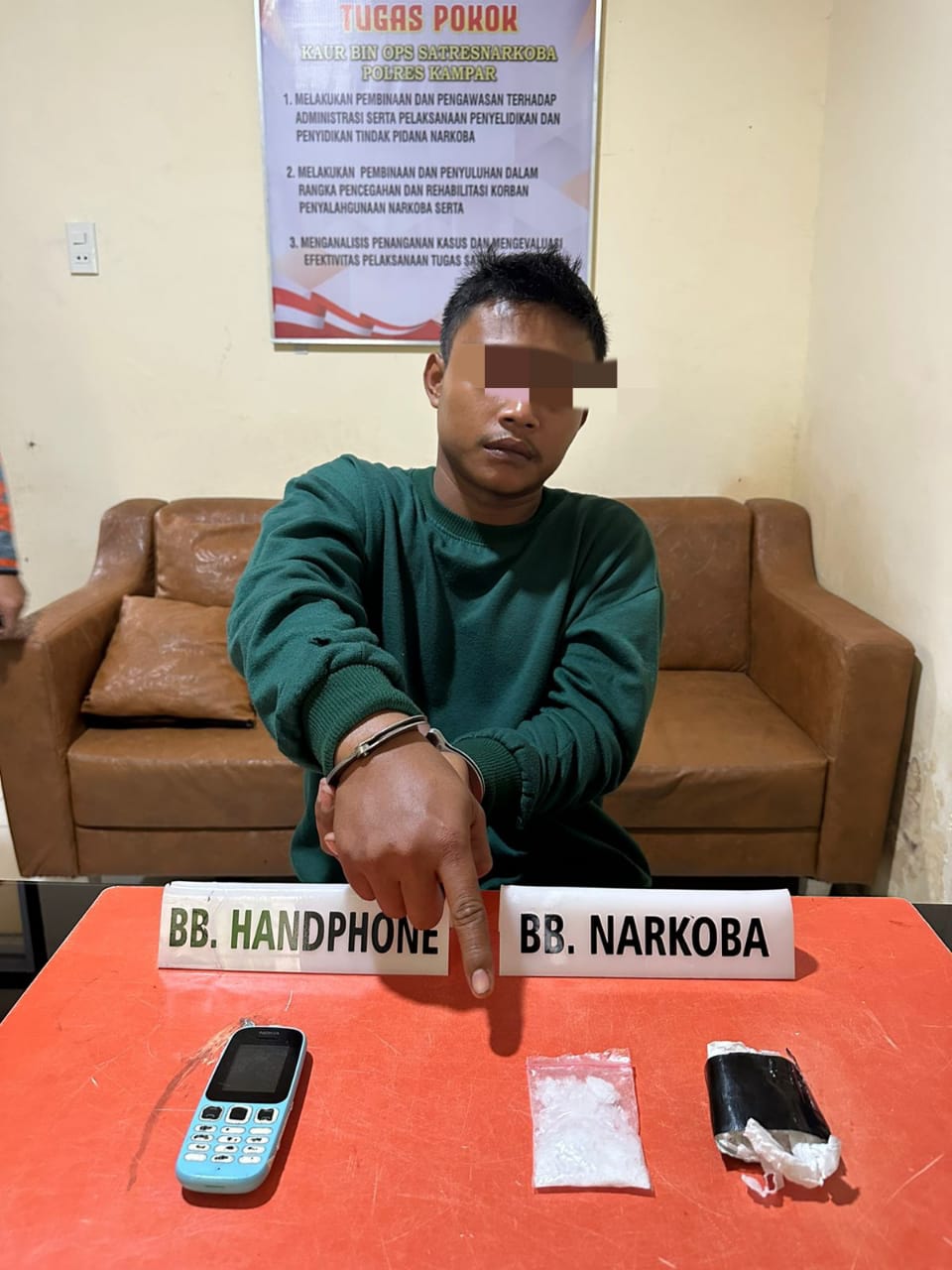 GUNUNGSAHILAN, ULASFAKTA.COM,- Tim ojoloyo atau Satnarkoba Polres Kampar berbasil mengamankan seorang pelaku Nakoba, dari tangan penangkapannya berhasil mengamankan Narkoba jenis Shabu-shabu dengan berat bruto 11.96 Gram.