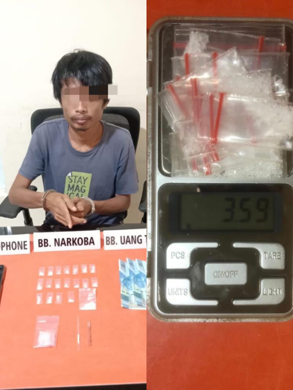 Barang bukti berupa 19 paket diduga narkotika jenis shabu yang dibungkus dengan plastik klip putih bening., (Bruto 3.59 Gram), Handphone Merk Oppo, kaca pirex, sendok sabu dari pipet, seball plastik klip putih bening dan uang hasil penjualan sebesar Rp 200.000.