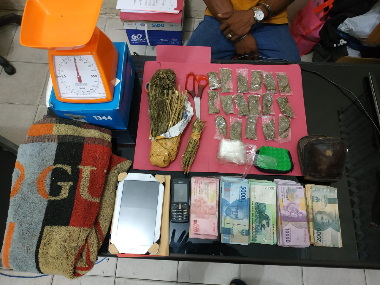 Dari tangan pelaku berhasil diamankan barang bukti berupa 17 paket kecil daun ganja kering yang dibungkus plastik bening Dan 1 paket besar dibalut lakban warna kuning berisi narkotika jenis tanaman daun ganja kering, barang bukti lain yang disita adalah ikat ranting tanaman daun ganja kering, timbangan warna orange merk Tanita, dompet warna hijau, dompet warna coklat, gunting, 1 pak plastik bening, handuk merk Guess, Handphone nokia warna hitam tanpa simcard, handphone Samsung warna putih, sepeda motor Honda Astrea warna hitam tanpa nomor polisi dan uang tunai sebanyak Rp. 2,550,000 (dua juta lima ratus lima puluh ribu rupiah).