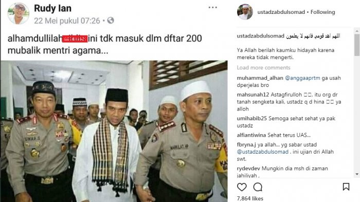 Melalui akun instagram resmi miliknya yang memiliki 2,6 juta followers, Abdul Somad memposting sebuah pesan yang dikirimkan oleh seseorang tentang ia yang tidak masuk satu di antara 200 mubalgh yang jadi rujukan Kemenag