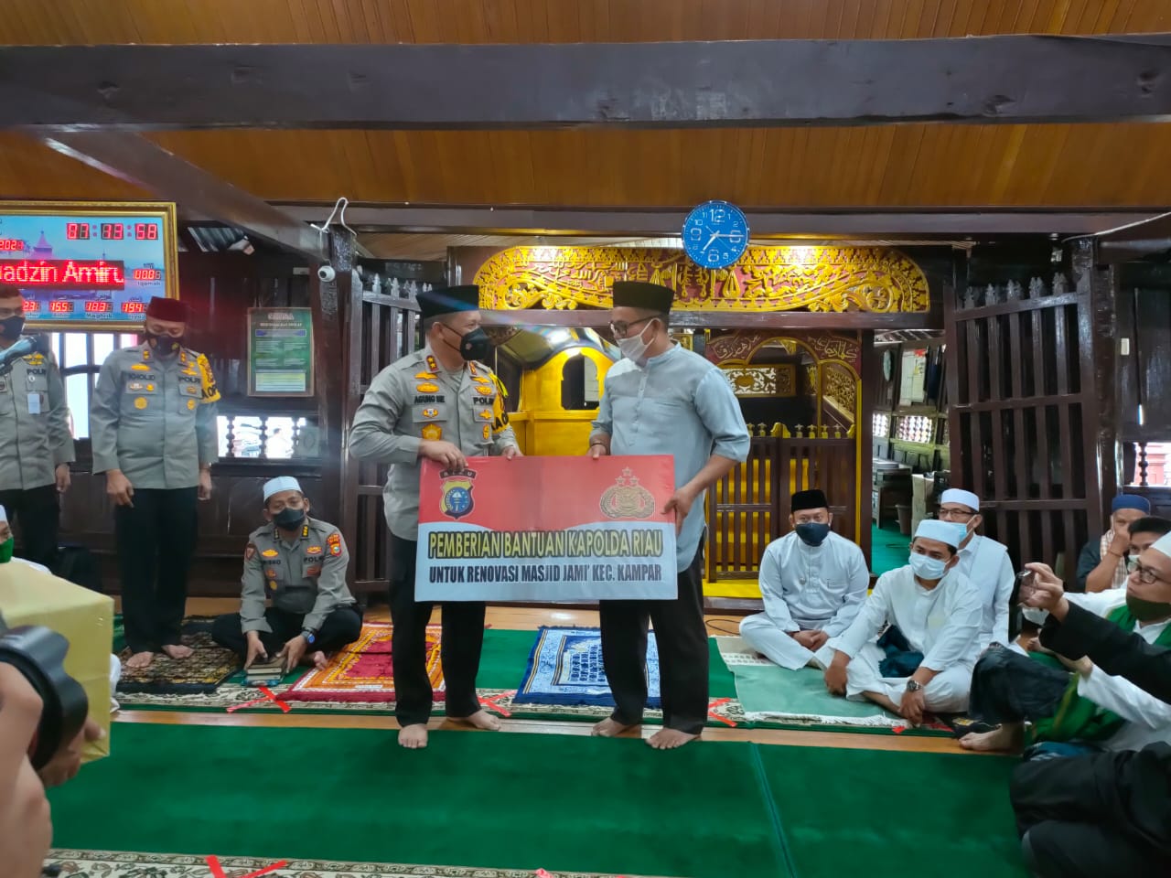 Usai menyampaikan sambutannya, Kapolda Riau menyerahkan Bantuan untuk Renovasi Masjid Jami’ Air Tiris, yang diserahkan secara simbolis kepada Pengurus Masjid Jami’ Air Tiris, bantuan berupa Kubah Menara Masjid dan 100 Al Qur’an.