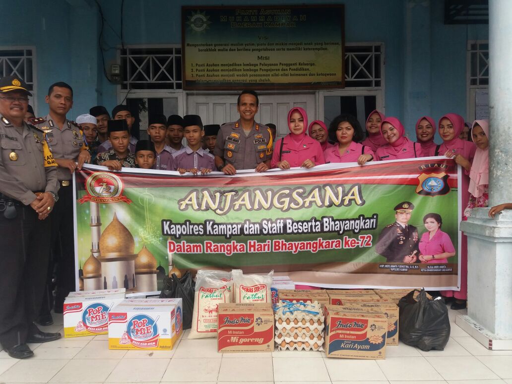KAMPAR, ULASFAKTA.com – Rabu 13 Juni 2018 sekira pukul 15.30 wib, Kapolres Kampar AKBP Andri Ananta Yudhistira SIK MH didampingi Ketua Cabang Bhayangkari Kampar Ny. Ola Andri Ananta beserta Waka Polres, Kabag Sumda dan segenap Pengurus Bhayangkari melakukan anjangsana dalam rangka memperingati Hari Bhayangkara ke-72 tahun 2018.