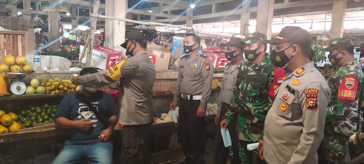Para personel TNI-Polri ini dibawah pimpinan Kapolsek Siak Hulu memasuki kawasan Pasar Ulul Albab, mereka menyampaikan himbauan tentang penerapan protokol kesehatan dan membagikan puluhan masker kepada masyarakat yang membutuhkan.