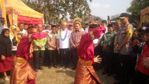 Selanjutnya dilakukan pengalungan bunga dan pemasangan Tanjak kepada Mendikbud RI dan Dirjen Dikdasmen serta Wakil Gubernur Riau, rombongan kemudian menuju tenda kehormatan diiringi Kesenian Tradisional Dikiu Gubano.