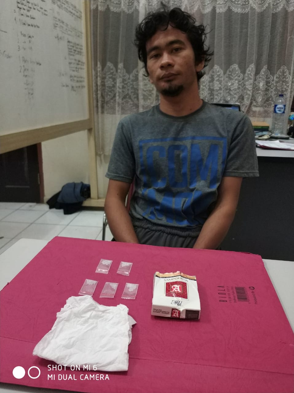 Ia ditangkap di Jalan Prof. M. Yamin SH Kelurahan Langgini Kecamatan Bangkinang Kabupaten Kampar. Dari tangannya berhasil diamankan barang bukti berupa 5 paket diduga narkotika jenis shabu yang dibungkus plastic bening, 1 lembar tisu warna putih, 1 buah kotak rokok merk sempurna, 1 unit sepeda motor supra warna hitam tanpa nomor polisi.