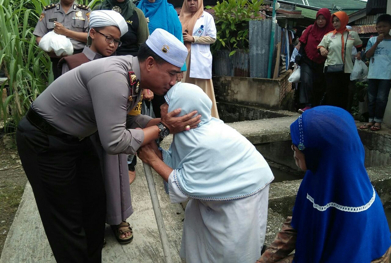 RESTA PEKANBARU– Demi membantu masyarakat yang kurang beruntung dan dalam rangka pengabdian terbaik sebagai Bhayangkara Negara, tim Jum’at Barokah Polresta Pekanbaru tetap menjalankan program sosialnya walaupun bertepatan hari libur nasional. Tim menuju ke rumah seorang yang hidup sendirian di Jalan Sembilang RT 04/RW 02 Kelurahan Limbungan Baru, Kecamatan Rumbai Pesisir Pekanbaru, Jumat pagi (30/03/2017) pukul 10.00 WIB.
