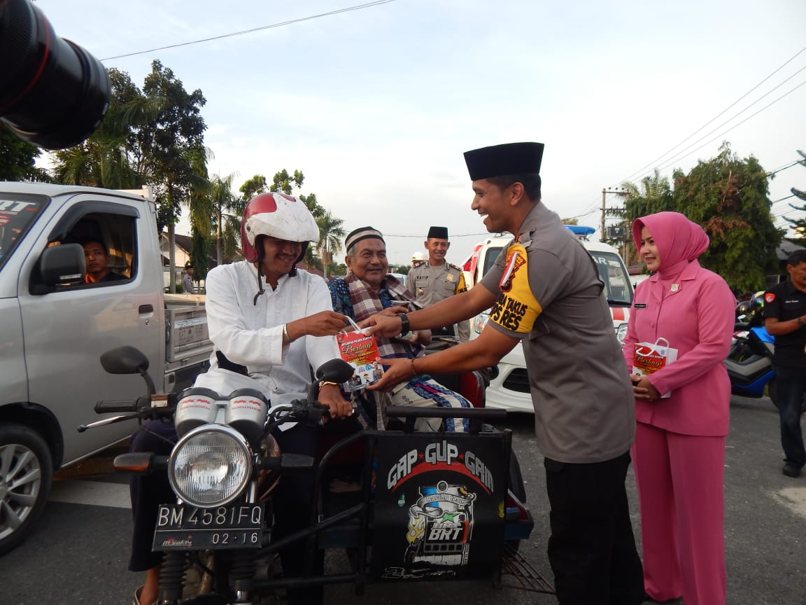 Sebanyak 120 Paket Takjil berupa makanan dan minuman untuk berbuka puasa, dibagikan kepada pengguna jalan yang melintas di jalan raya depan Mapolres Kampar yang dinilai tertib dalam berlalulintas.