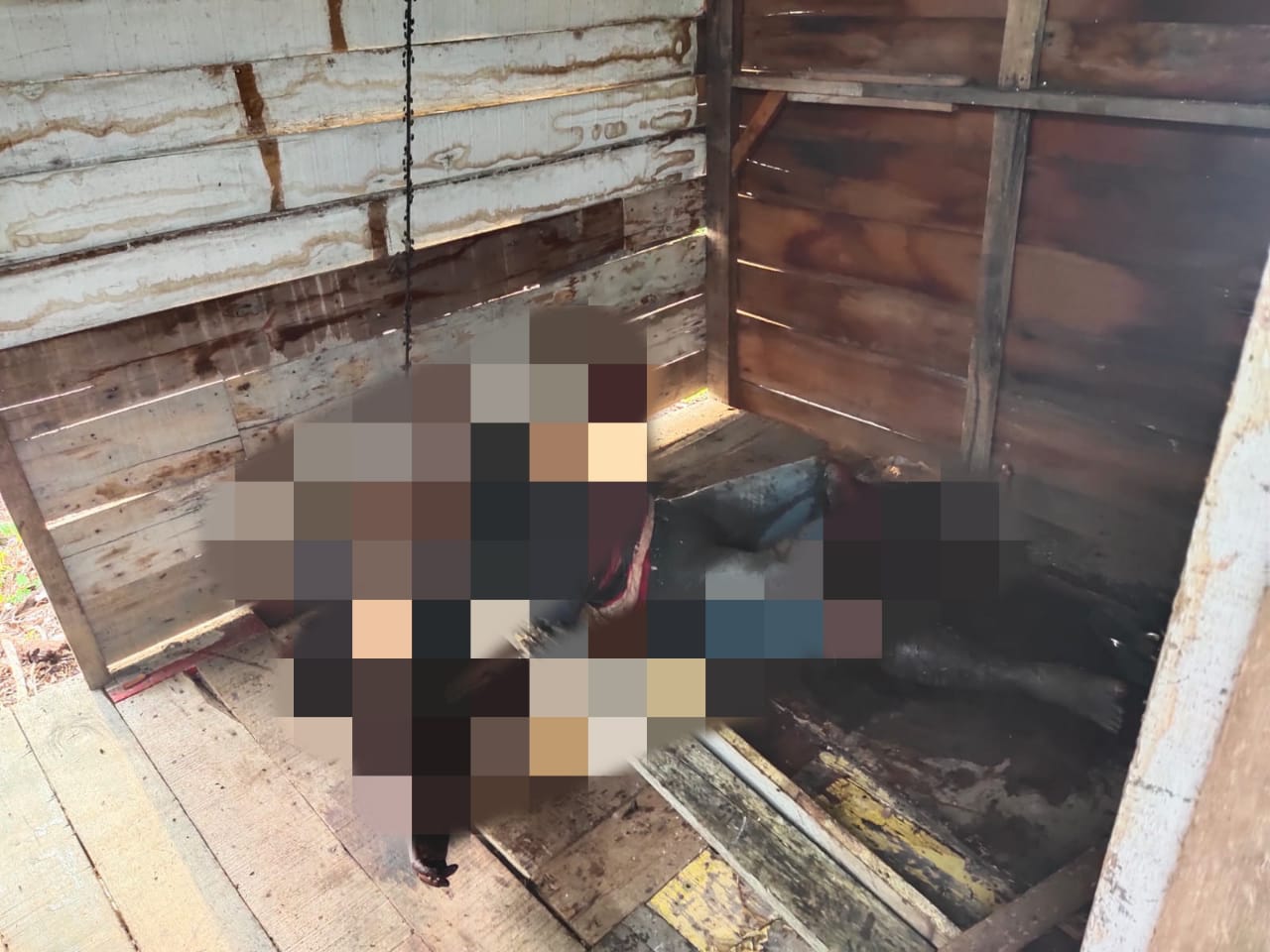 Keduanya langsung kaget, saat melihat ada seorang mayat laki-laki di dalam pondok dalam keadaan leher terikat tergantung dan mayat menggunakan baju kaos kra bergaris dan celana pendek jeans dalam posisi leher terikat dengan tali tergantung.