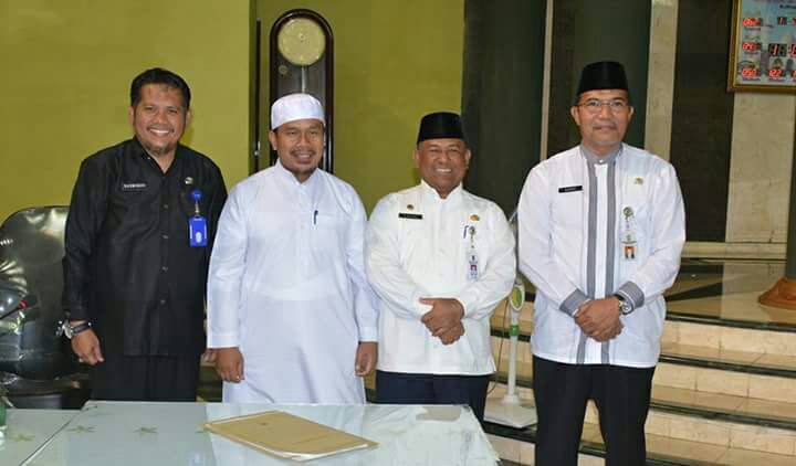 Teks foto : SEKDA Kampar Drs. Yusri foto bersama Ketua Umum Markaz Islami Nurbit, Imam Besar DR. Mawardi Saleh serta Kabag Kesra Sasminedi Saleh usai penandatangan berita acara serah terima jabatan pengurus periode 2014-2018 kepada pengurus periode 2018-2022.