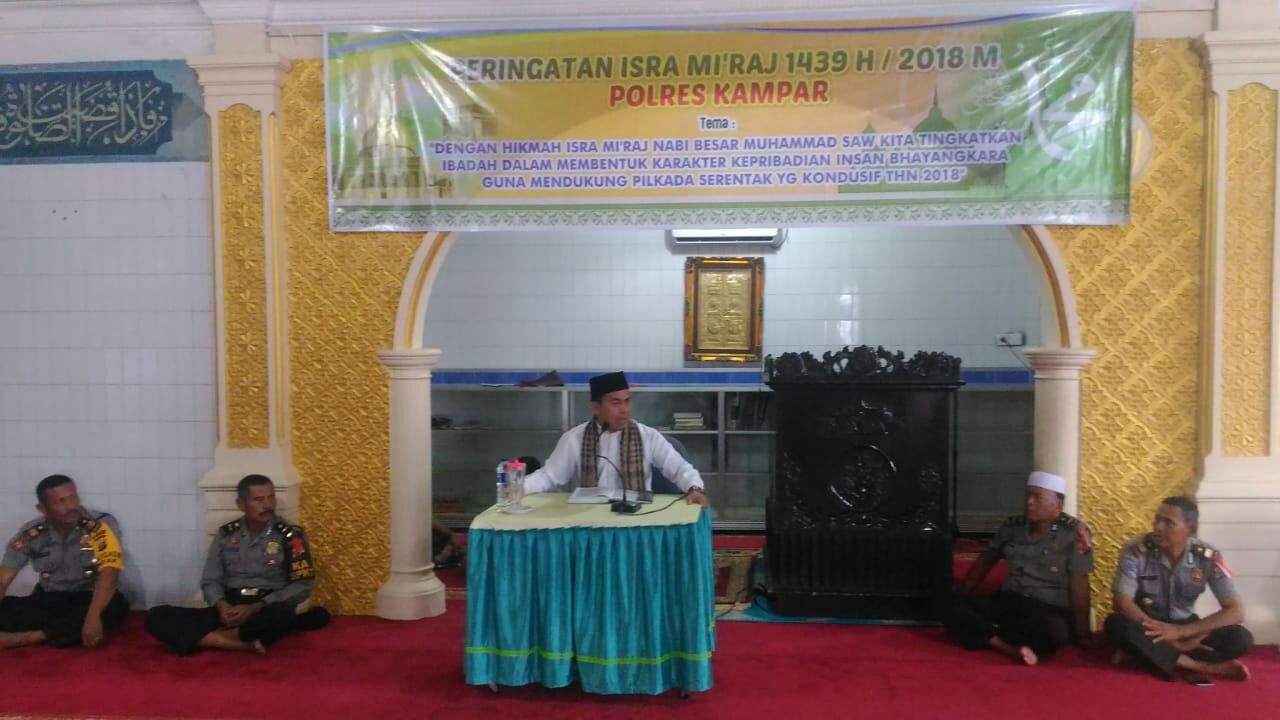 Adapun tema peringatannya “Dengan Hikmah Isra Mi’raj Nabi Besar Muhammad SAW, kita tingkatkan ibadah dalam membentuk karakter kepribadian insan Bhayangkara, guna mendukung Pilkada Serentak yang kondusif tahun 2018”.