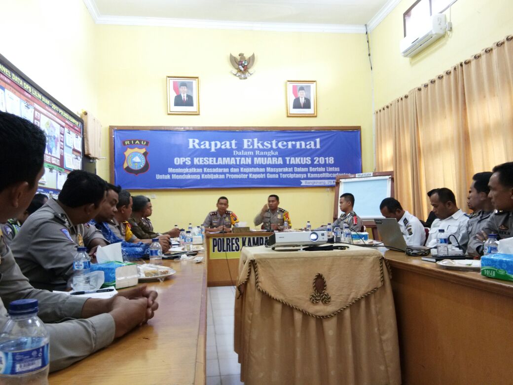 BANGKINANG KOTA, ULASFAKTAcom – Senin (26/2/2018) pukul 10.00 wib, di ruang data Polres Kampar dilaksanakan Rapat Eksternal dalam rangka Operasi Keselamatan Muara Takus 2018 dengan tema “Meningkatkan kesadaran dan kepatuhan masyarakat dalam berlalulintas untuk mendukung kebijakan Promoter Kapolri guna terciptanya Kamseltibcarlantas”.