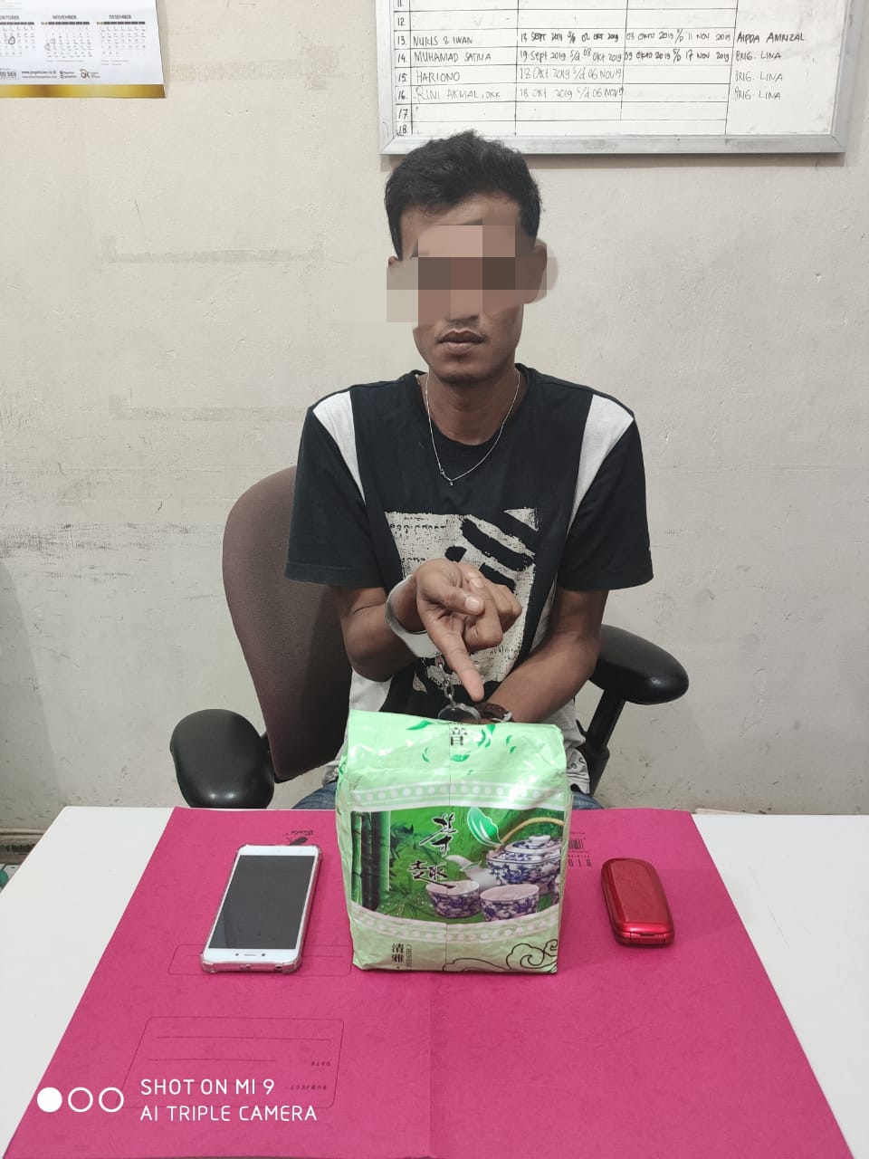 Dari tangan pelaku ini berhasil diamankan 1 (satu) bungkus besar narkotika jenis shabu, yang disembunyikan dalam kemasan teh cina warna hijau serta 2 unit Hp yang digunakan pelaku.