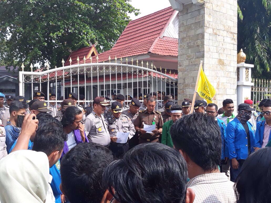 Unjuk rasa tersebut awalnya terjadi aksi dorong mendorong antara pengunjuk rasa dengan polisi, namun aksi tersebut tidak berselang lama setelah pihak polisi mencoba untuk menegoisasi dengan mahasiswa tersebut.