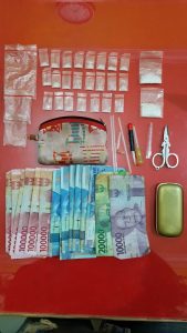 Dari tangan pelaku ditemukan barang bukti 23 paket kecil dan 2 paket sedang narkotika jenis shabu terbungkus plastik bening, 1 unit sepeda motor Nopol BM-5575-ZY, sejumlah peralatan penggunaan shabu dan uang tunai sebesar Rp 1.130.000.