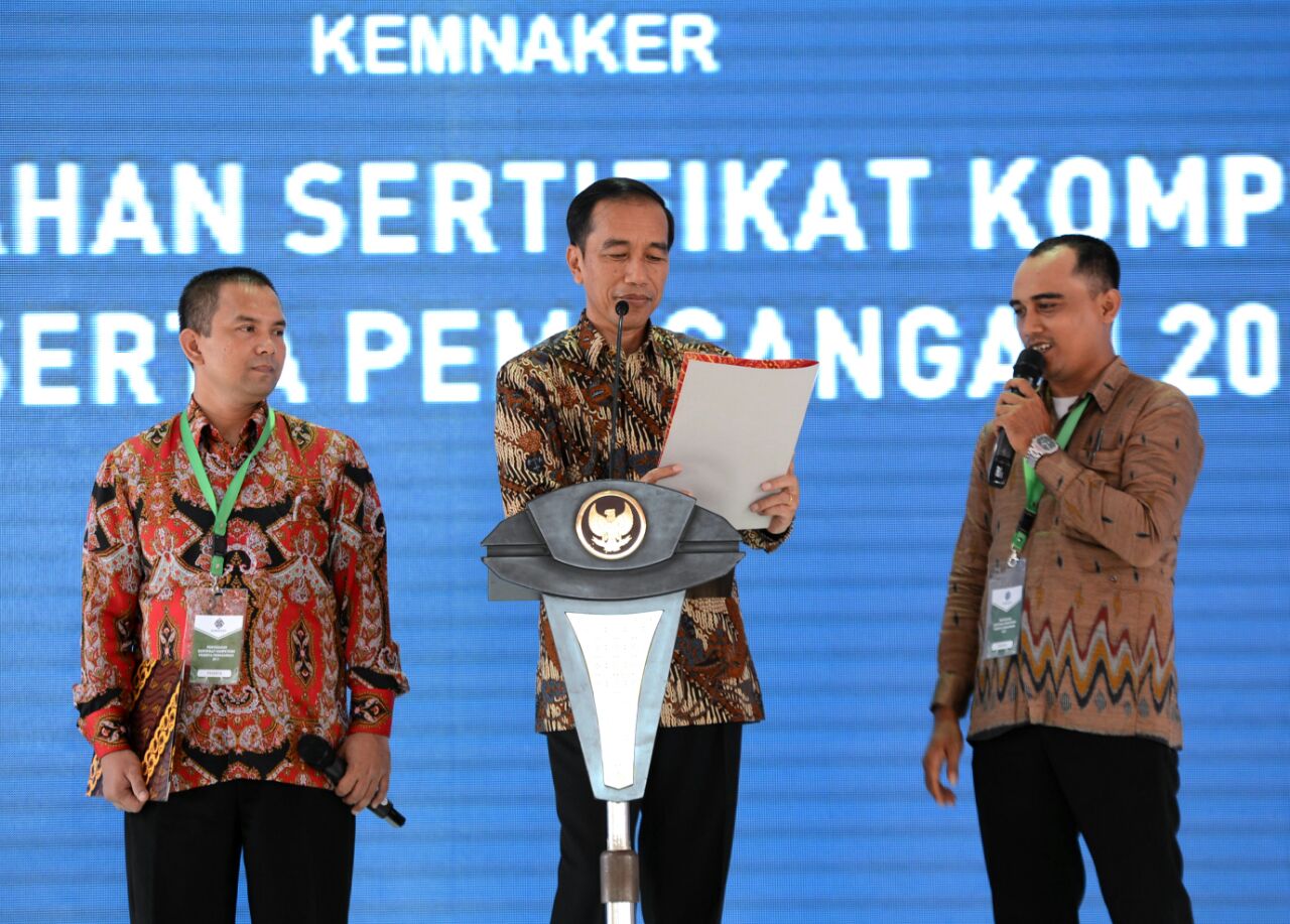 “Artinya apa? Uji kompetensi ini benar-benar dilakukan. Karena ada yang tidak lulus. Kalau lulus semuanya malah saya curiga,” ujar Presiden saat memberikan sambutan dalam acara Penyerahan Sertifikat Kompetensi Peserta Pemagangan Tahun 2017 di Balai Besar Pengembangan Latihan Kerja, Bekasi, pada Rabu, 27 Desember 2017.