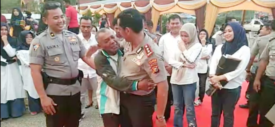 Saat mendekati mobilnya, tiba-tiba ada hal yang mengagetkan para personel Polres Kampar termasuk AKBP Asep Darmawan sendiri, ada seseorang pria paroh baya yang langsung memeluk erat AKBP Asep sambil menangis terisak-isak.
