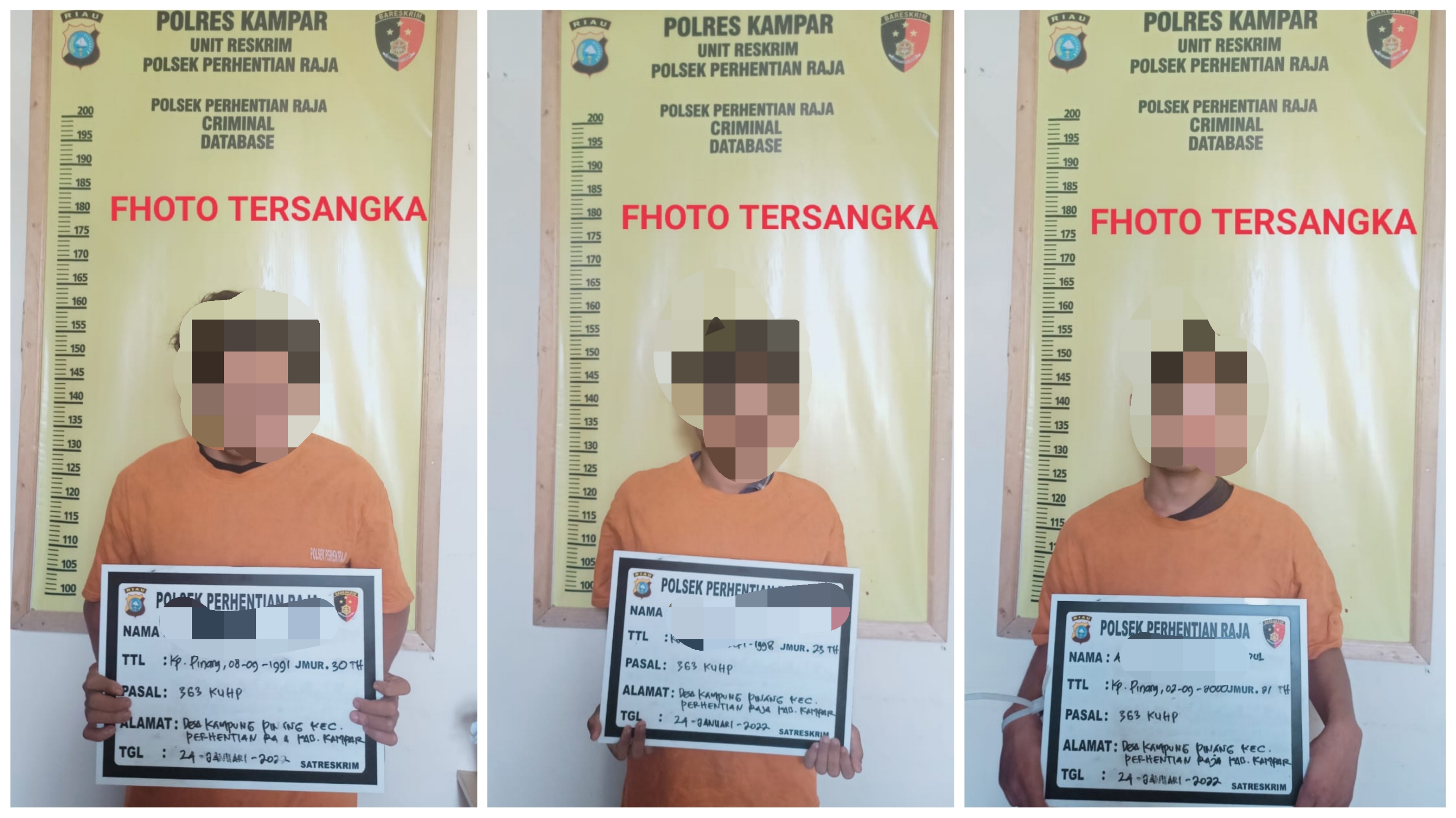 PERHENTIAN RAJA, ULASFAKTA.COM, – Unit Reskrim Polsek Perhentian Raja amankan 3 orang yang tertangkap tangan melakukan pencurian 48 tandan buah sawit, di perkebunan milik CV. Makmur Jaya Sentosa yang berlokasi di Blok A7 Kebun CV. Makmur Jaya Sentosa Desa Kampung Pinang Kecamatan Perhentian Raja Kabupaten Kampar, pada Senin pagi (24/01/2022).