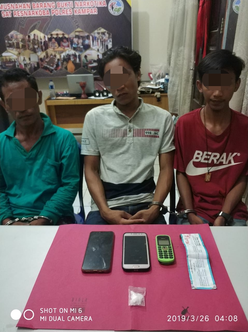 Menindaklanjuti informasi tersebut Tim Opsnal Satresnarkoba Polres Kampar langsung mendatangi lokasi tersebut untuk melakukan penyelidikan, sesampai di lokasi petugas menemukan 3 orang yang diduga akan melakukan transaksi narkoba.